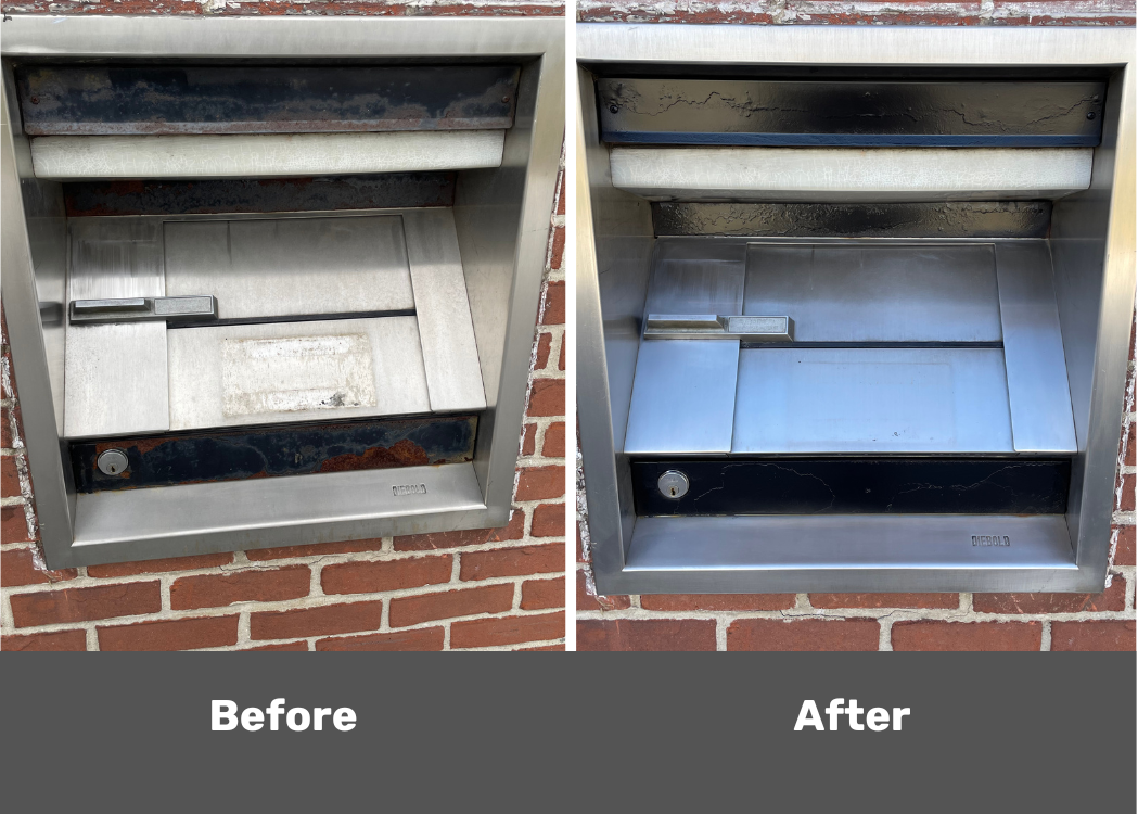 Before and after for a bank night drop. Metal restore and polish. Sand and repaint the black trim.