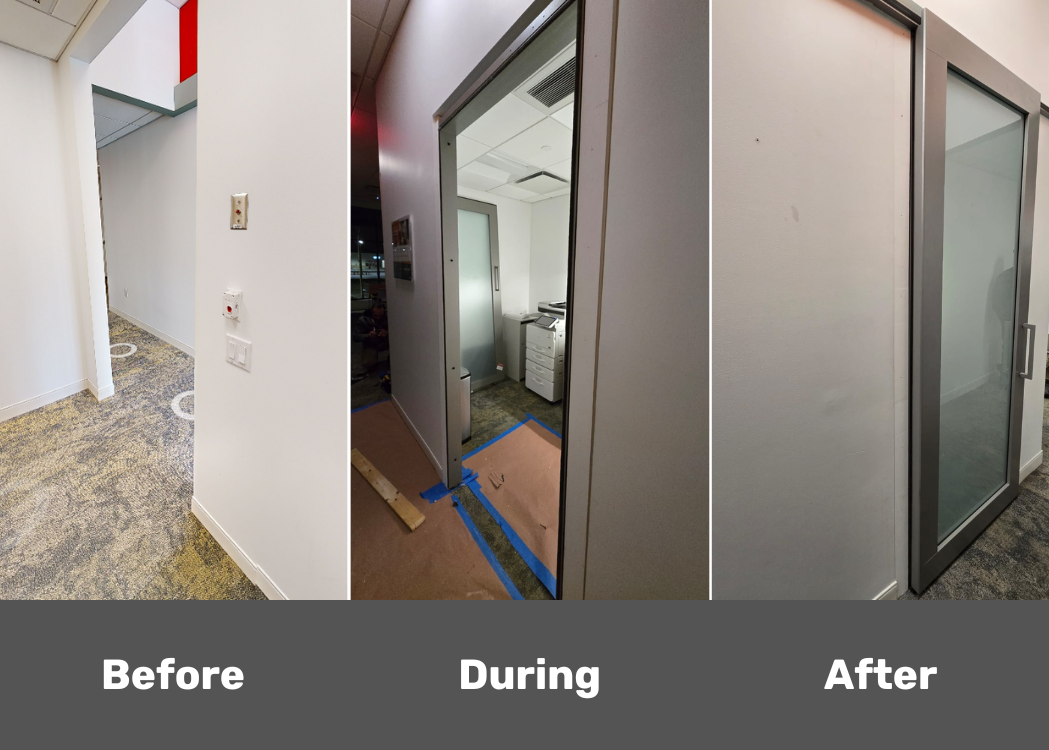Installation of a door in a bank to create an office.
