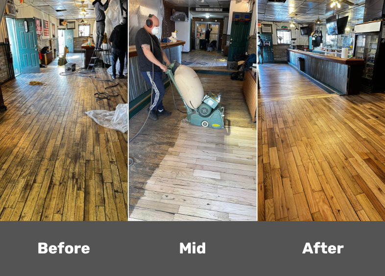 A mild refresh of a wood floor in a restaurant.