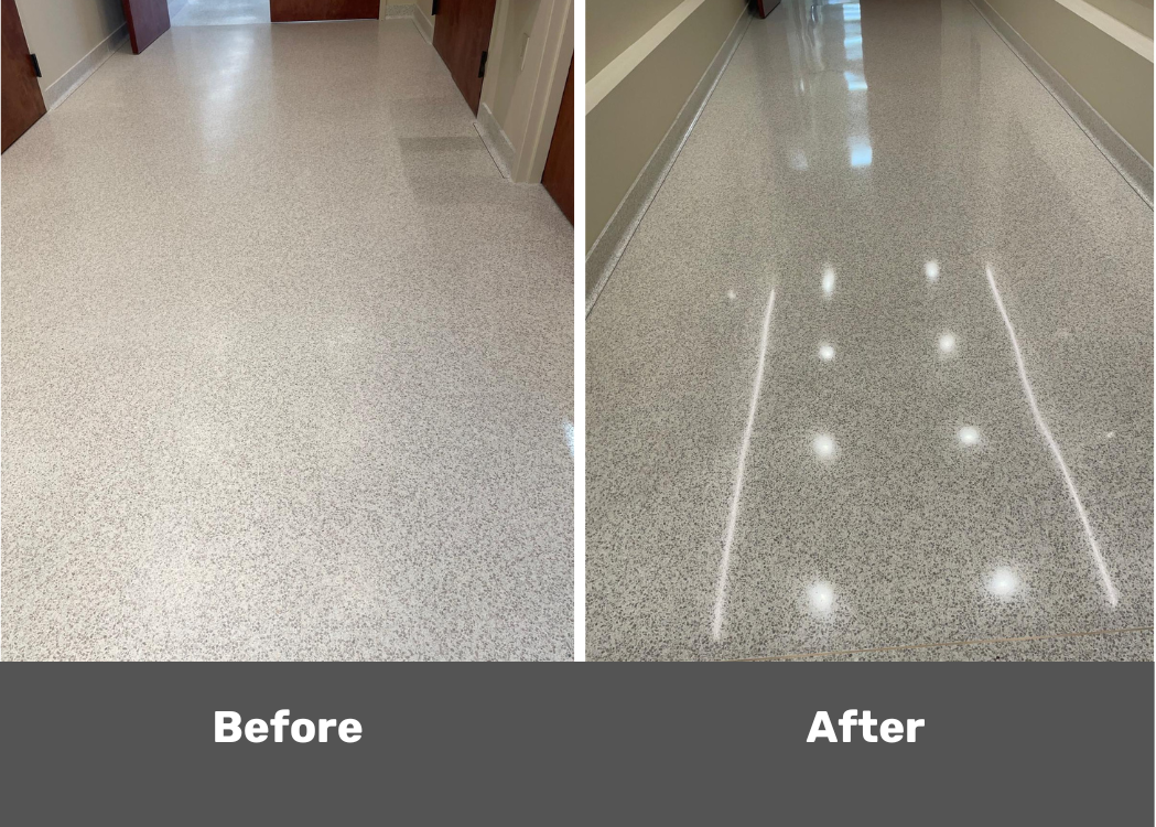 Here is a recent job we did at a Hospital in Pottstown, PA. We put down a brand new VCT floor that, instead of going with the strip and wax method, we put down a urethane so that it will last for up to 5 years resulting in significant maintenance cost and time savings. Urethane floor coatings are superior to wax coatings in almost every way possible. In addition to the longer life of the coating, urethanes provide more chemical resistance, stain resistance, abrasion resistance, slip resistance, and are much easier to clean.