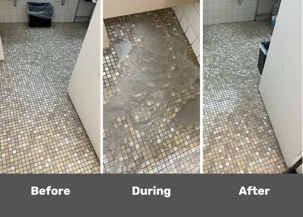 Tile/grout. Before cleaning. After clean. After grout color.