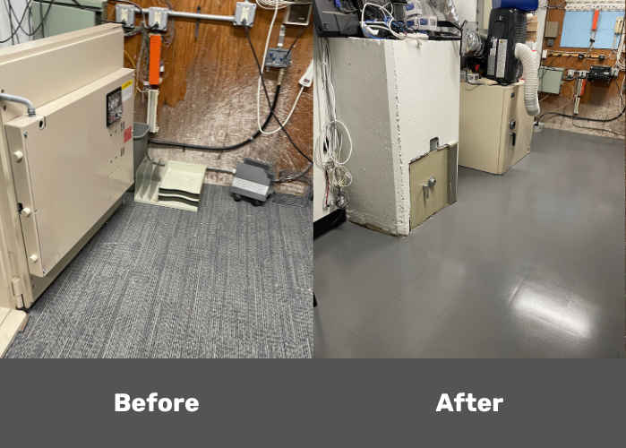 Before and after replacement from carpet to vct for an IT room.