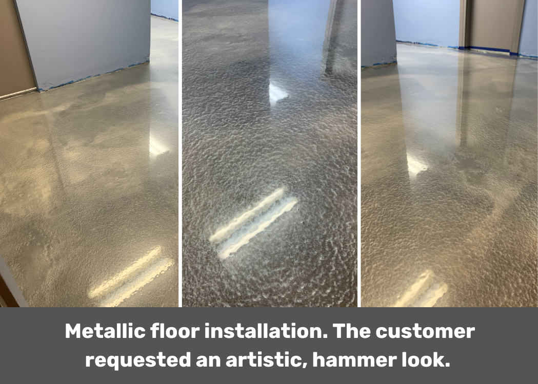Installation of epoxy with red metallic, with a different color base to make it more vibrant, followed with polyaspartic top coatings.